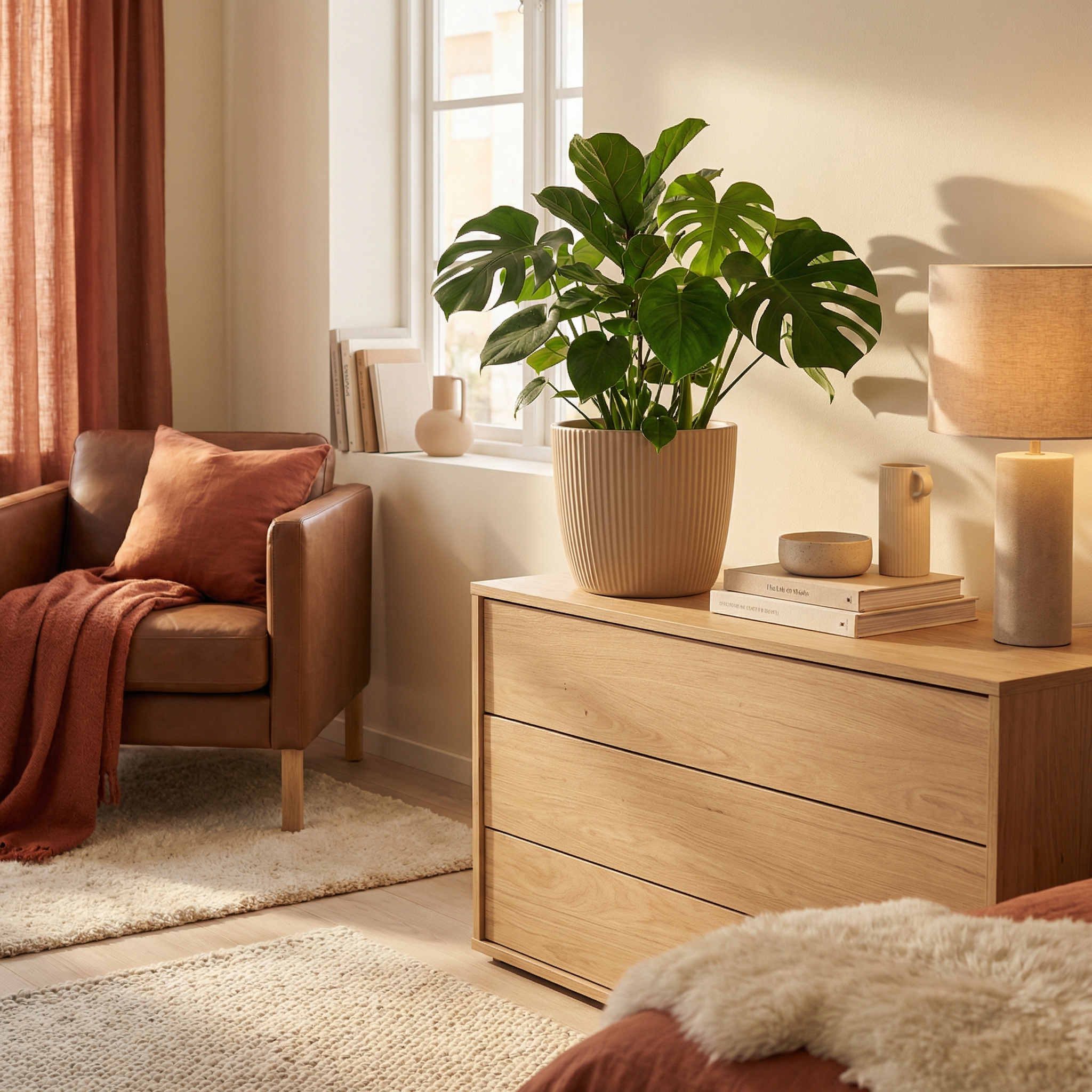 Hauptelement des gemütlichen wie modernen Einrichtungsstils ist Holz. Alle Farben von Aura passen perfekt auf Tische und Sideboards aus Eiche, Buche oder Nussbaum. Großpflanzen wie eine Calathea orbifolia (Korbmaranthe) auf dem Tisch runden das Gesamtbild ab, denn der Urban Jungle ist schon lange nicht mehr auf Fensterbänke und den Boden begrenzt. Und auch bei den Größen können Pflanzenbegeisterte mit Aura aus dem Vollen schöpfen. Creme, Dry Reed, Jade und Anthrazit lassen sich in verschiedenen Größen bis XL kombinieren sowie mit Peach in kleineren Formaten arrangieren.