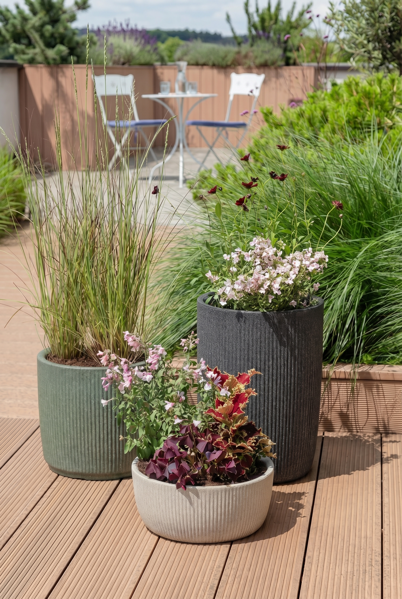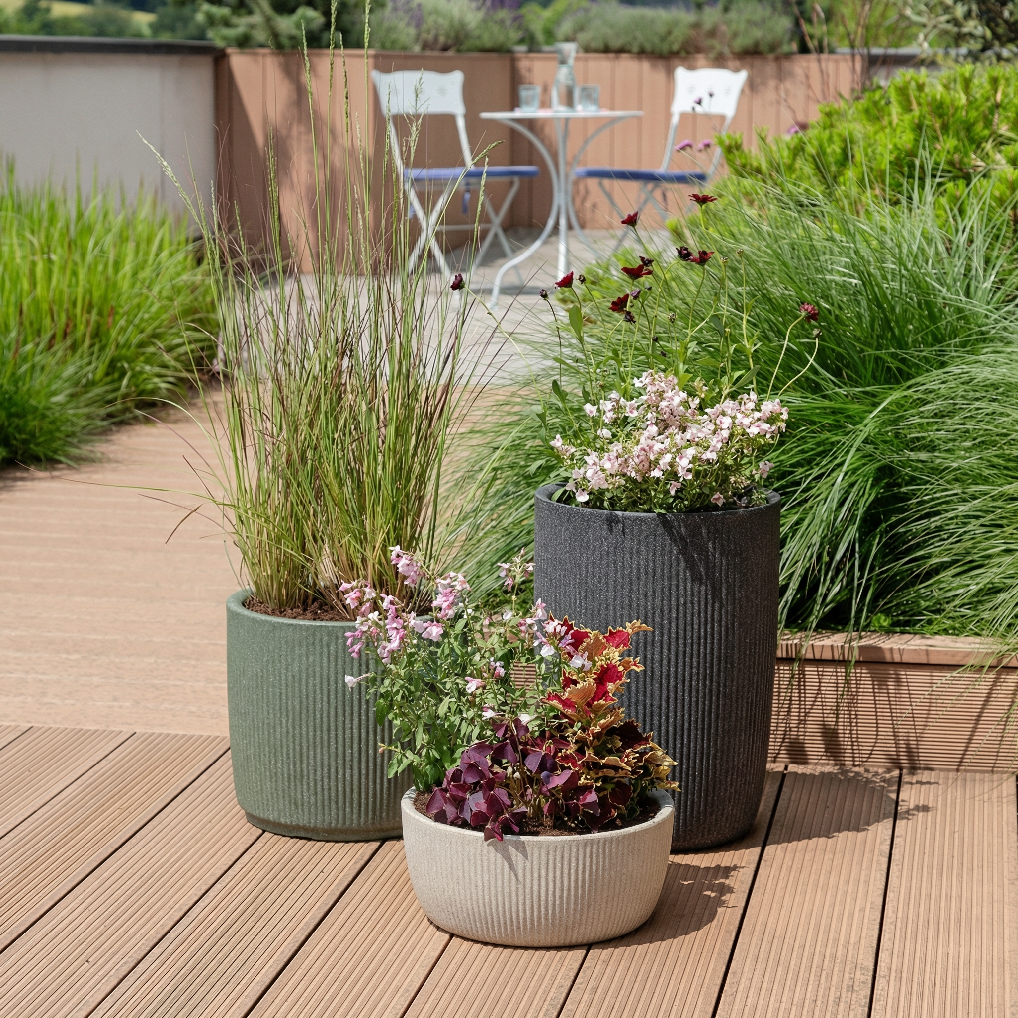 Unverkennbar Linetto: Die Neuheiten zeigen sich mit vertikalen Rillen, der lebendigen dreidimensionalen Oberfläche und der gewohnt dickwandigen Beschaffenheit. Die Freude an weiteren Gewächsen und damit an neuen Gefäßen für den Outdoor-Bereich ist bei Pflanzenfans groß: Ein Liebesgras (Eragrostis curvula) sieht im Pflanzgefäß wunderschön aus. Gleich mit mehreren Pflanzen wie Rotem Glücksklee (Oxalis triangularis), Buntnessel (Solenostemon scutellarioides) und Herbstsalbei (Salvia greggii) werden die Bowl und das neue „kleinere“ Hochgefäß mit einer Schokoladenblume und einem Elfensporn (Diascia-Hybriden) bestückt.