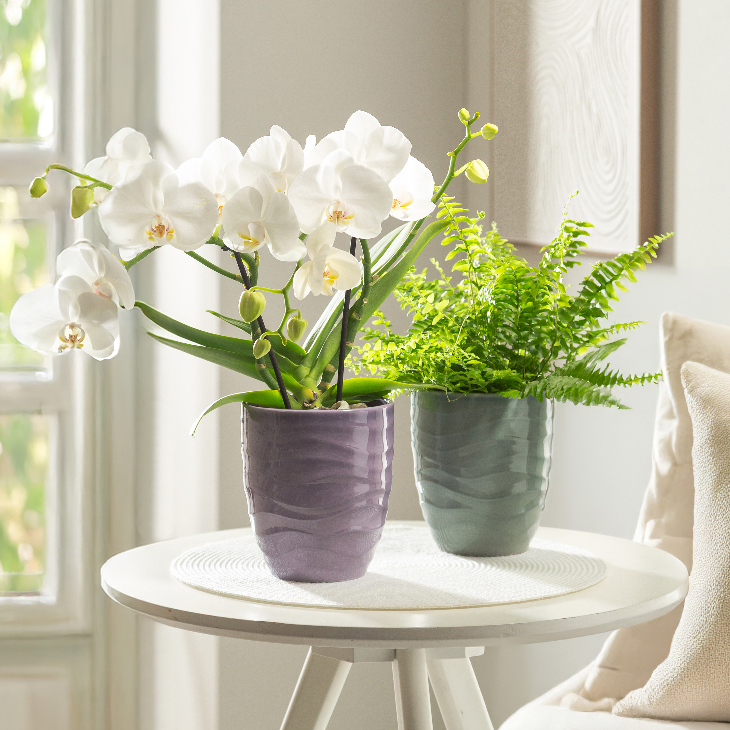 Im modern eingerichteten Wohnzimmer werden Orchideen gerne neben einer schlichten Grünpflanze wie einem Nephrolepis (Schwertfarn) auf Beistelltischen oder Kommoden platziert – Hauptsache der Standort ist hell. Für die weiteren idealen Bedingungen sorgt Breeze: Die Wurzeln kommen durch die perfekte Topfform nicht mit überflüssigem Gießwasser in Berührung.