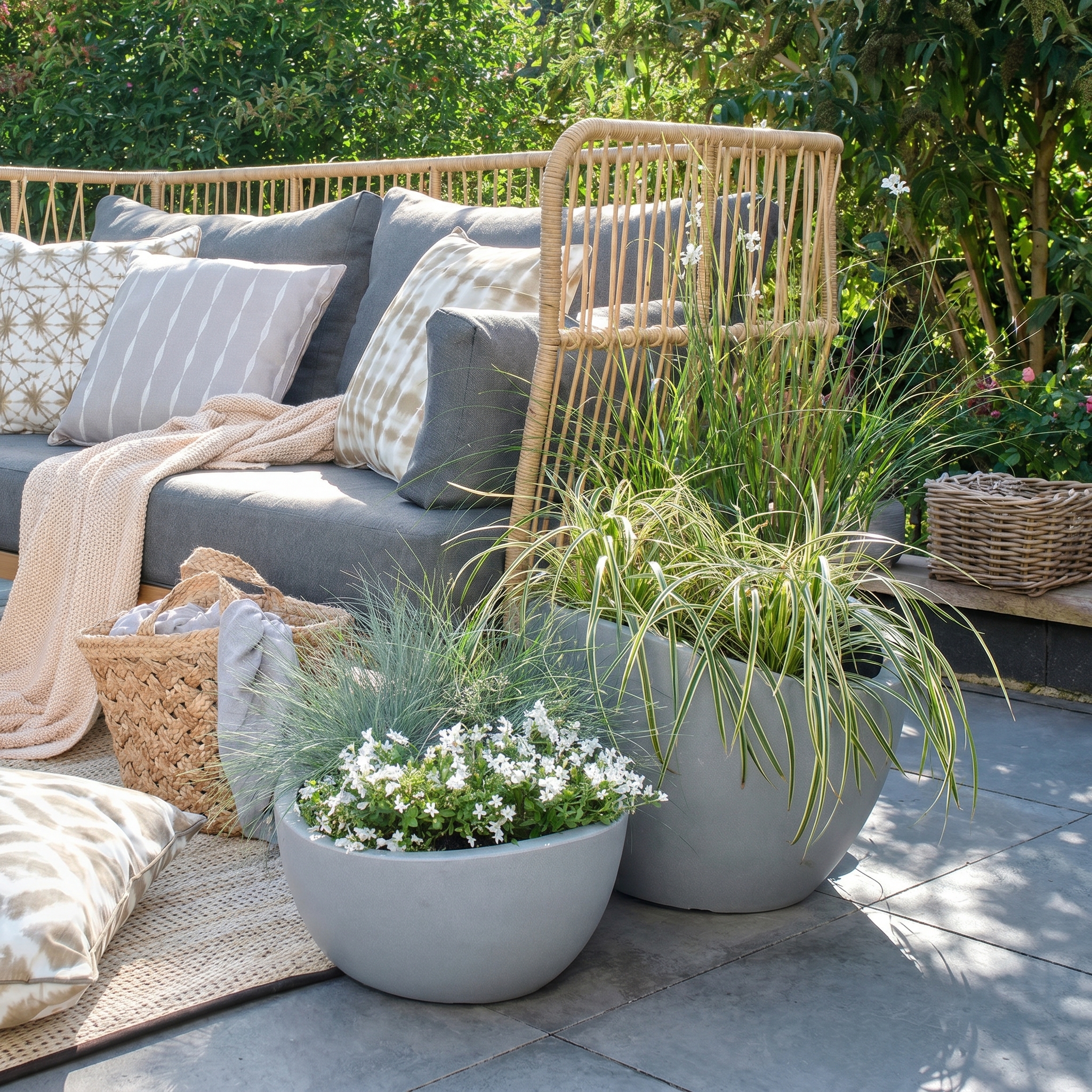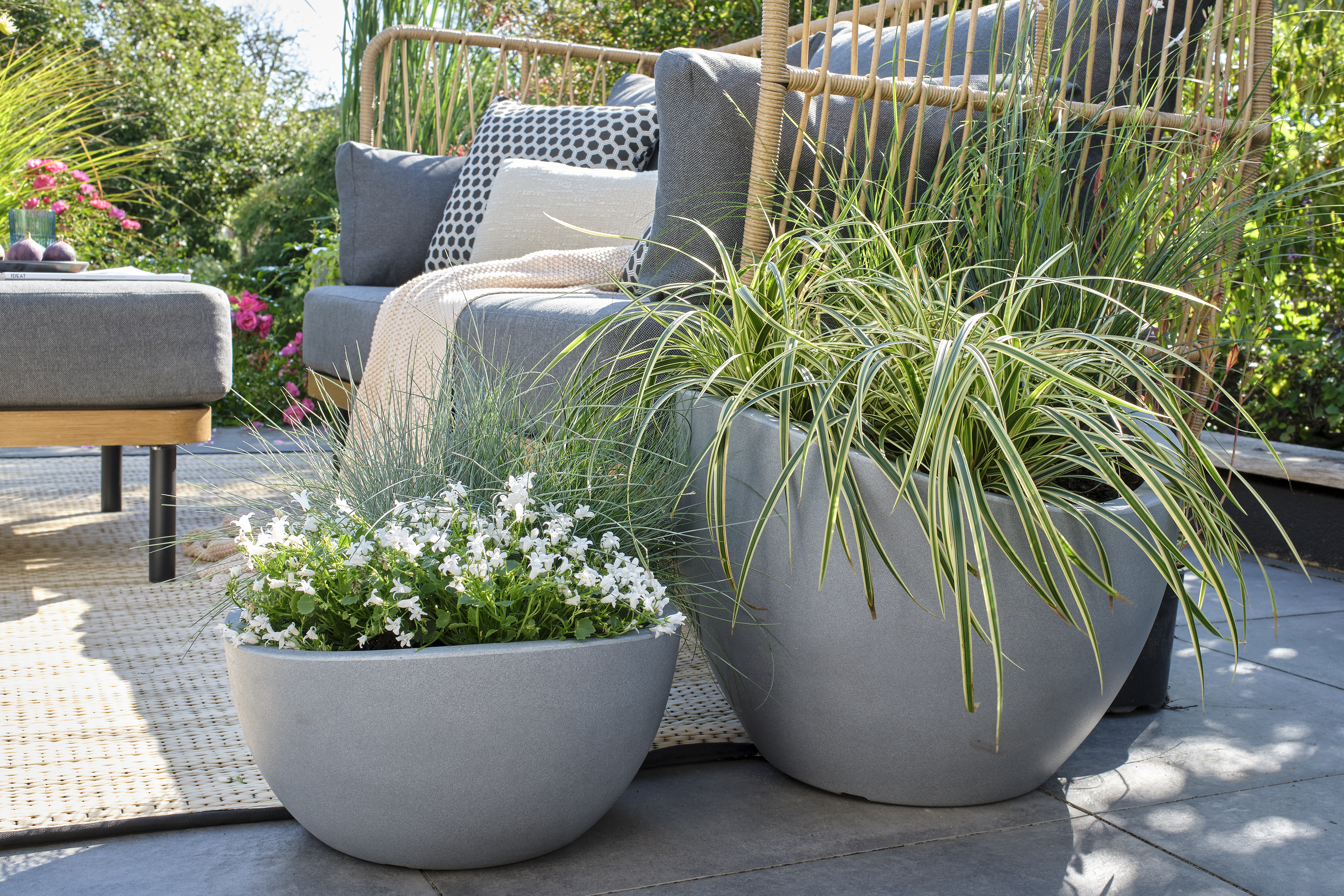 Größen, Varianten und Farben harmonieren bei Wave Globe perfekt: Mit 11 Formen und mehr als 20 Artikeln bietet die Pflanzgefäßserie in dickwandiger Optik eine beeindruckende Vielfalt für dekorative Arrangements mit saisonal wechselnden Pflanzen. Wave Globe ermöglicht die Gestaltung des Outdoorbereichs mit unterschiedlichen Gefäßen im einheitlichen Look. Zur Designlinie gehören runde Pflanzgefäße, elegante Hochgefäße, eine Schale, eine Jardiniere und die eckige Variante Cubo – jeweils in den Farben Stony Grey und Schwarz-Granit.